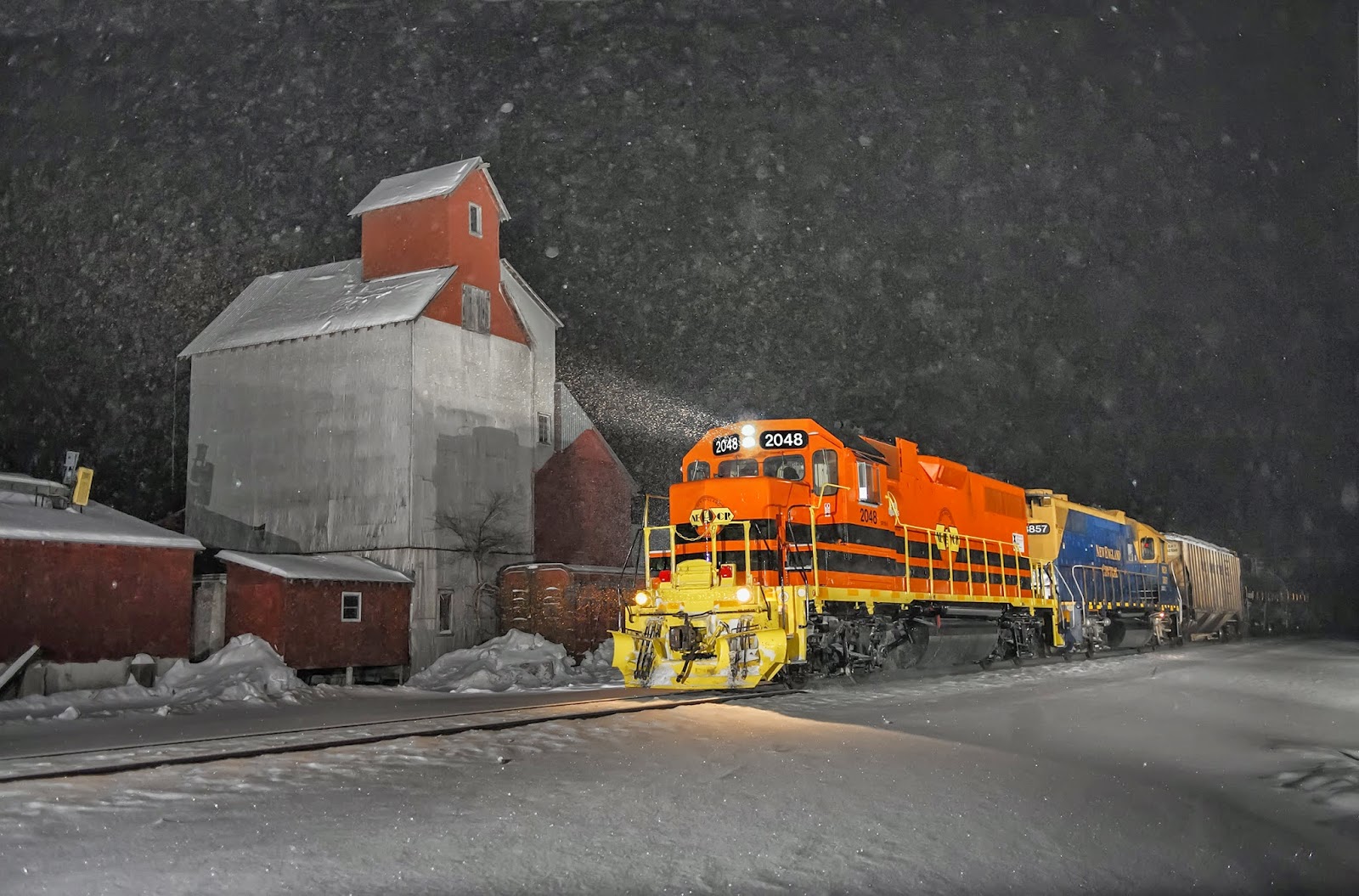 The snow is coming down heavy now, its light powder snow, and with no wind it accumulates on the equipment, especially the flash unit heads, further diffusing the light from them. Not to worry though, the snow will NOT be melting for several weeks yet, it can just be blown off the equipment afterwards tonight. The camera and lens being the exception of course. I give the crew ten minutes to pull off the branch and get underway then go over to the stepladder, take the camera out of the bag and get all set under the brightly colored umbrella standing on the second step from the top. Maybe ten minutes later I hear the welcome sound of an air horn blowing for a crossing. The umbrella is carefully collapsed and put away. This is the best! In a snowstorm, at night, GP 38-2s heading towards me and the temps are in the mid-teens above zero! A few minutes later 2048 rounds the curve below me and comes into sight, drifting up the tangent track into position. The flash units light up the scene in the blink of an eye as the GP 38-2s roll past me braking prior to doing their work here at the feed mill. I climb down off the stepladder and kneeling in the snow inspect the image..............Success! Shot in Milton, Vermont on Feb. 19, 2015 at 05:55. Special thanks to Ed Ferguson. Please enjoy! Comments are welcomed.